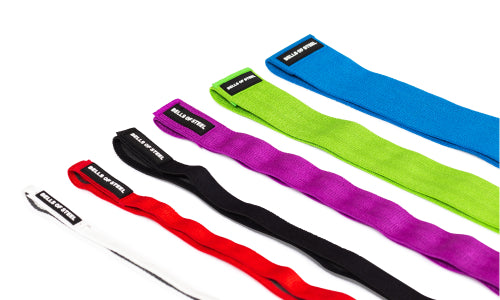 Five flat, 41" Fabric Non-Slip Resistance Bands by Bells of Steel—blue, green, purple, black, red, and white—are laid out horizontally on a white background. Each band is labeled for easy selection for powerlifting or mobility routines.