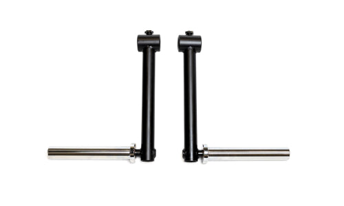 Two black metal Bells of Steel Camber Bar Attachments (Pair) with horizontal silver rods are positioned parallel to each other on a white background.