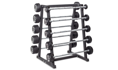 The Fixed Barbell Rack can hold fixed barbells or traditional Olympic barbells.