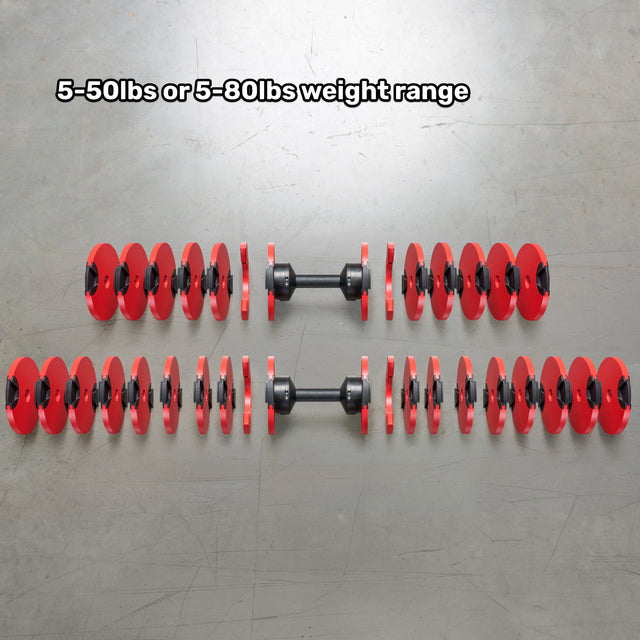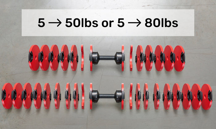 Get the power of 10 (5-50 lb) to 16 (5 to 80 lb) dumbbell pairs in the space of a shoebox. Perfect for small home gyms or multipurpose rooms.