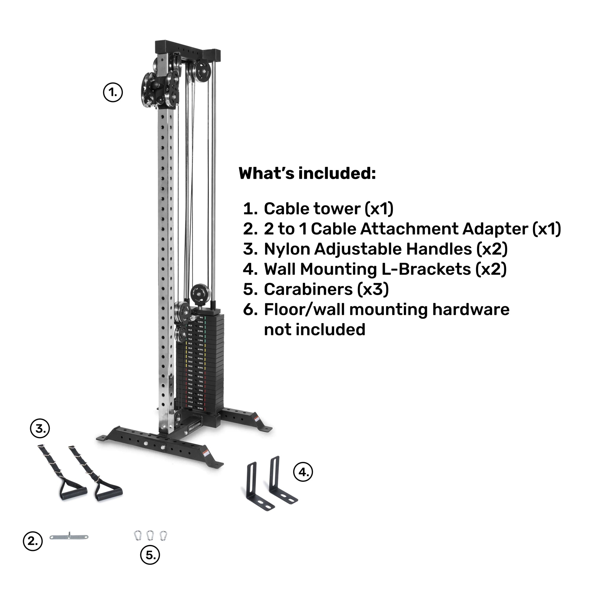 IMPORTANT: Due to their small footprint and tall height, Cable Towers MUST be bolted to the floor, wall or a power rack to ensure the user and equipment’s safety. Mounting hardware is not included — we recommend Tapcon+ screws. Ships unassembled.