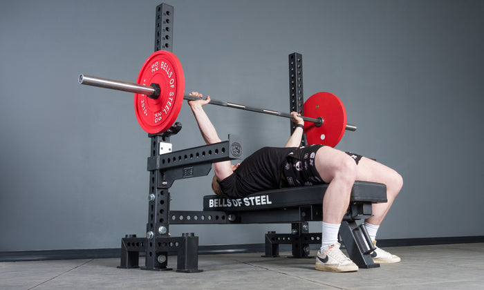 Powerlifters, this one’s for you. The single post angles outward for stability while staying completely out of the way for tucked-feet benching.
