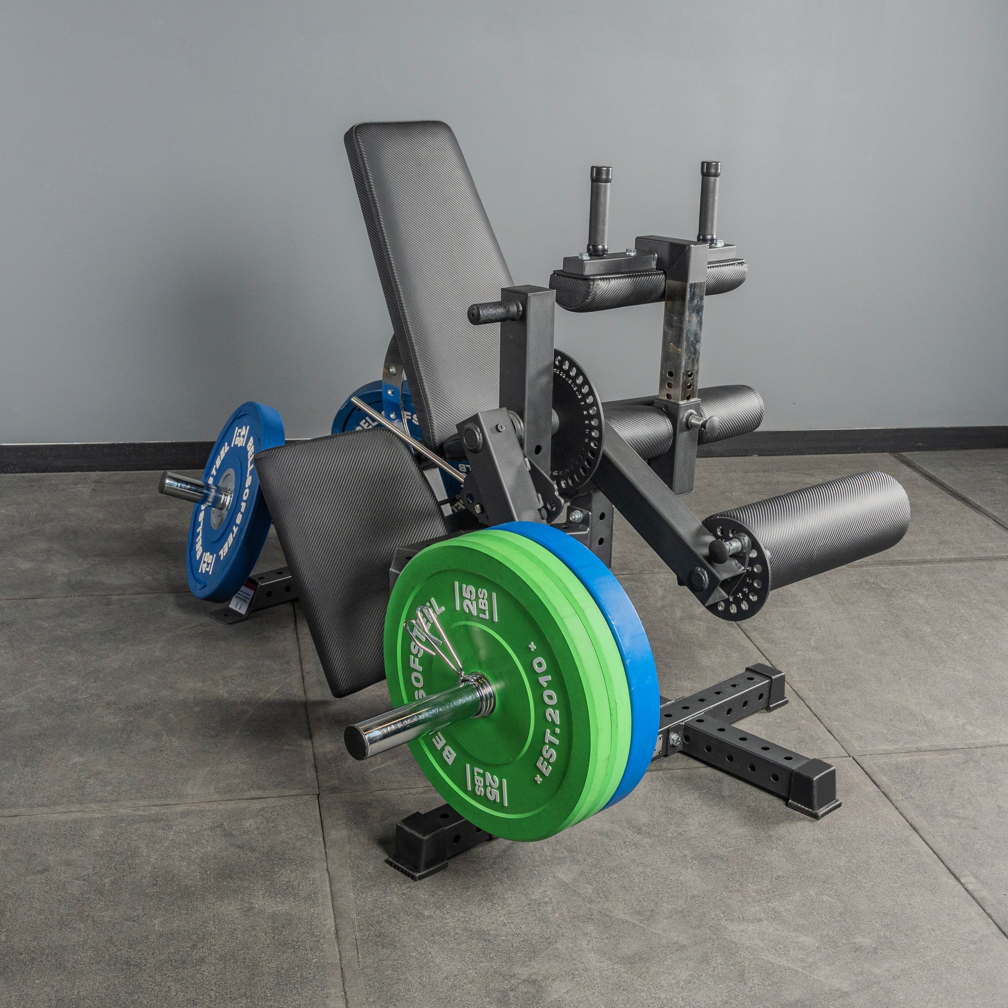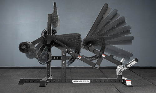 The Bells of Steel USA Legacy Leg Extension / Hamstring Curl Machine is a black plate-loaded unit with padded seat, backrest, and rollers. Designed for home strength training, it features a sturdy metal frame with foot and handle attachments.