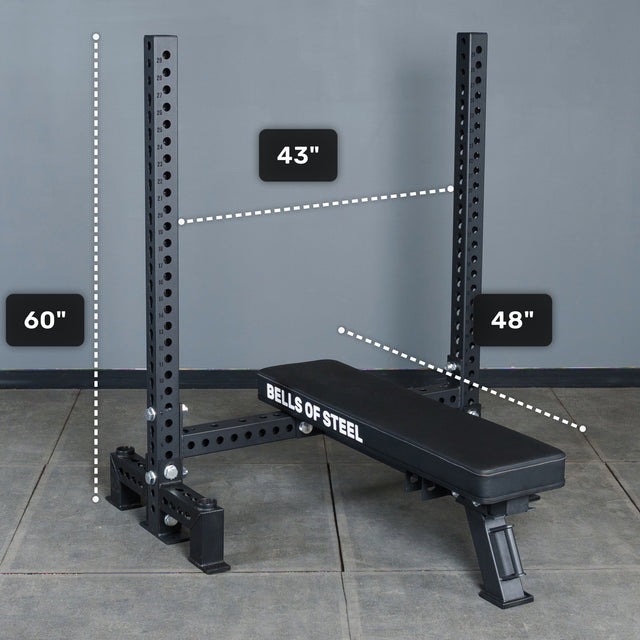 The two-post setup uses one pair of 60" uprights at the back and the Converter Bench’s own front foot on the other end. Front foot stabilizers keep everything locked in place. Add spotter arms for safe solo training that the old commercial gym benches never had.