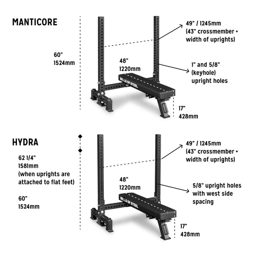 It’s less expensive than the four-post setup but gives you the same dedicated bench station experience. IPF height is maintained (because we engineered the crossmember holes and front foot height to line up perfectly), and you still get full access to all Hydra and Manticore attachments on the uprights.