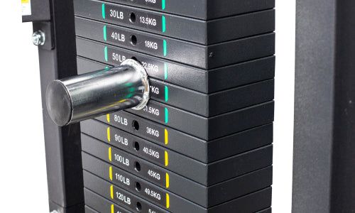 The 4.25" long centre rod goes completely through the weight stack & locks in with a hitch pin with a spring collar for extra peace of mind. Because the only plate you ever want flying towards you is a plate of tacos.