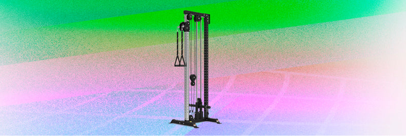 • The Bells of Steel All-in-One Trainer features adjustable pulleys, weight stacks, pull-up bars, and multiple handles—ideal for strength training and resistance workouts in any home gym. Wearing black and white shoes, a person performs a squat with green weight plates on the Bells of Steel All-in-One Trainer power rack in a home gym with gray tile flooring and a plain gray wall.