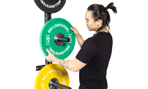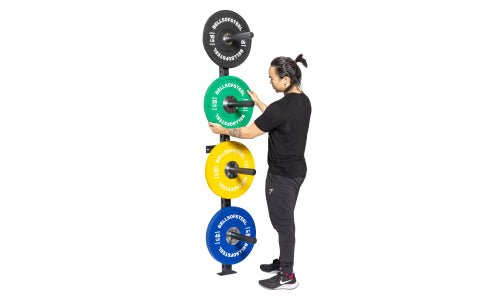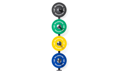The Wall Mounted Plate Storage Rack is the best of both worlds. This space-saving storage solution mounts directly to a stud or concrete wall to keep your plates tidy and secure. Four 12.6″ plate pegs and a 793lb total capacity offer plenty of space for your weight plates with 2" holes. Customize the peg spacing to show off your collection in style.