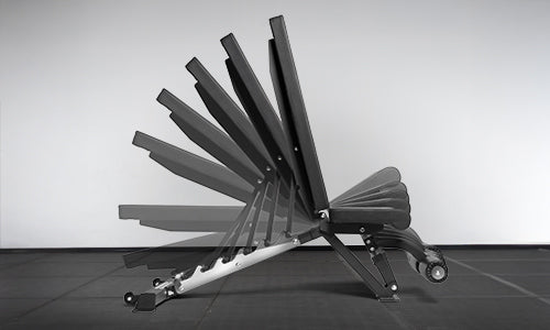 Beefier than the Utility Adjustable Bench but leaner than the Buzz-Saw Bench, it features 7 adjustable positions from 85 to -20 degrees, offering next-level muscle targeting and versatility, while the wheels and a handle make it easy to move and store.