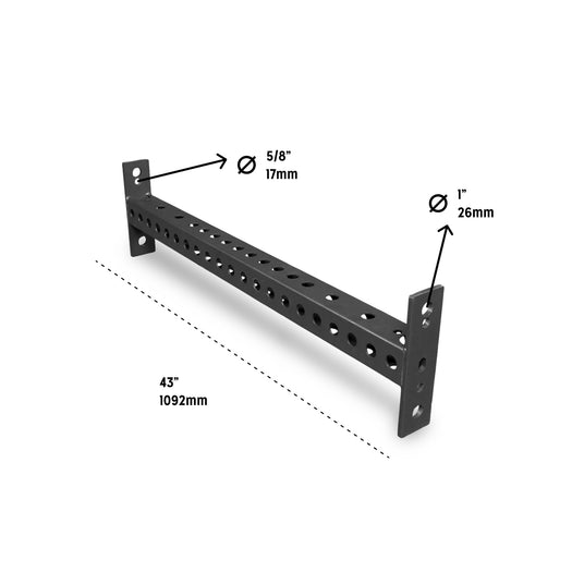 It’s a 43" crossmember with extra-large brackets and dual hole patterns — Manticore holes on the crossmember (to match the Converter Bench brackets) and oversized bracket holes that fit both Hydra and Manticore uprights.