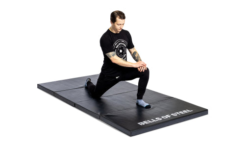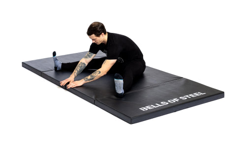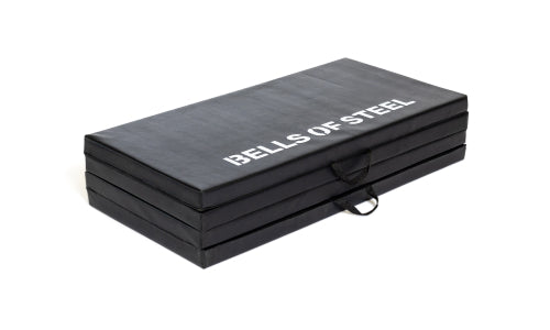 Two black Bells of Steel Four Fold Mats, one with a white "BELLS OF STEEL" logo, are shown partially unfolded and stacked together.