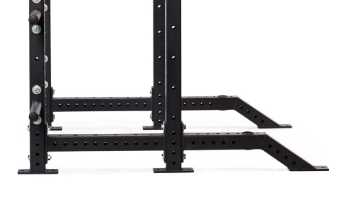With the front foot extensions and plate extension, you won't have to bolt your rack into your floor (or hire a contractor). The larger contact surface area makes the rack sturdier for racking/unracking your bar, during pull-ups, and when doing dips.