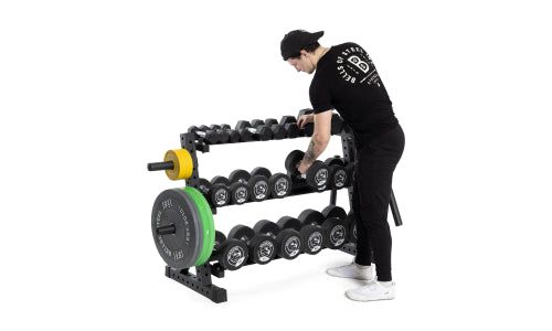 This three-tier Dumbbell Rack can handle up to 1,000lbs and is perfect for your home gym. Each rack fits our 5-50lb set or 55-80lb set of dumbbells.
