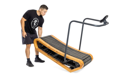 The Wooden Residential Manual Treadmill by Bells of Steel features a modern wood frame and black running surface. Its compact design includes an arched support bar and attached monitor, offering a stylish blend of functionality for minimalistic enthusiasts.