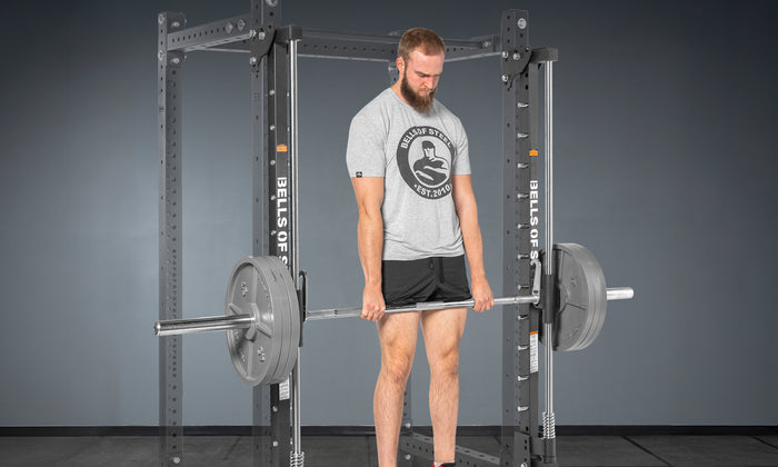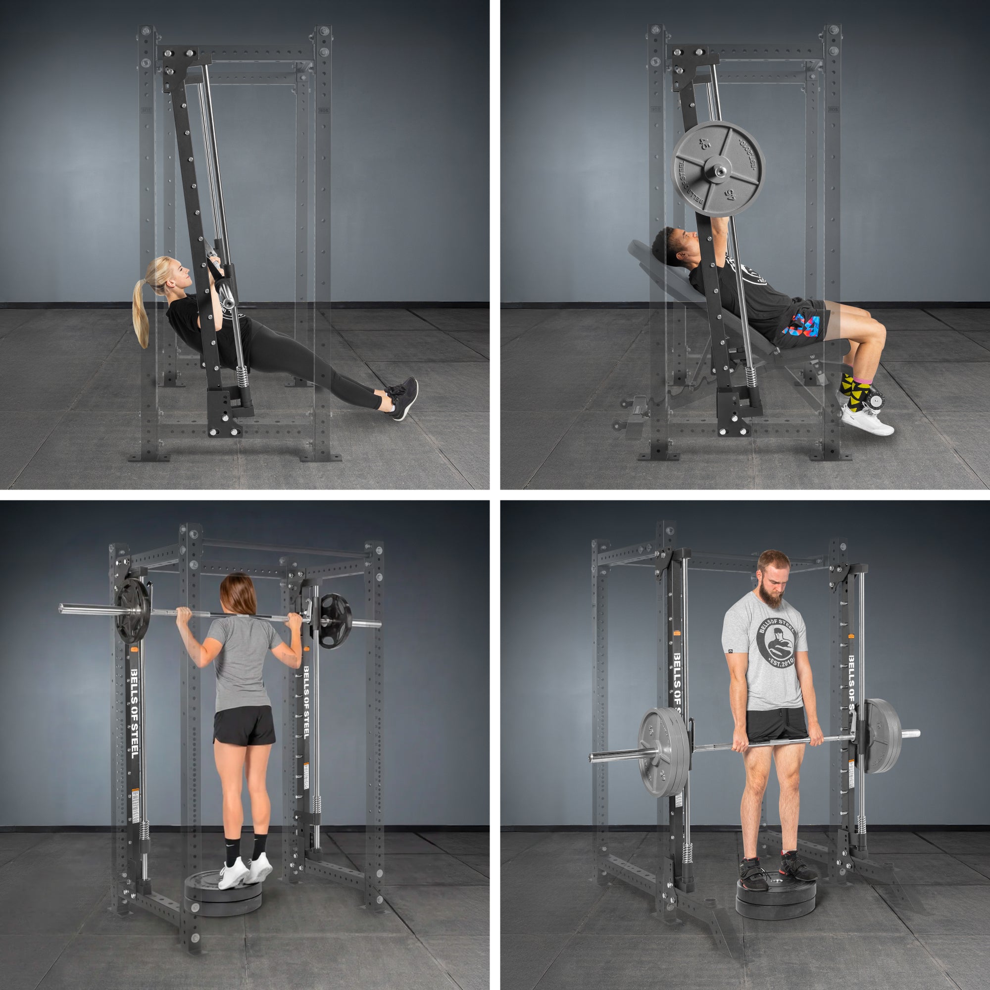 A sturdy silver power rack with adjustable safety bars and an optional Bells of Steel Smith Machine Rack Attachment features numerous holes for customizing height and configuration, ideal for weightlifting exercises like squats and bench presses.