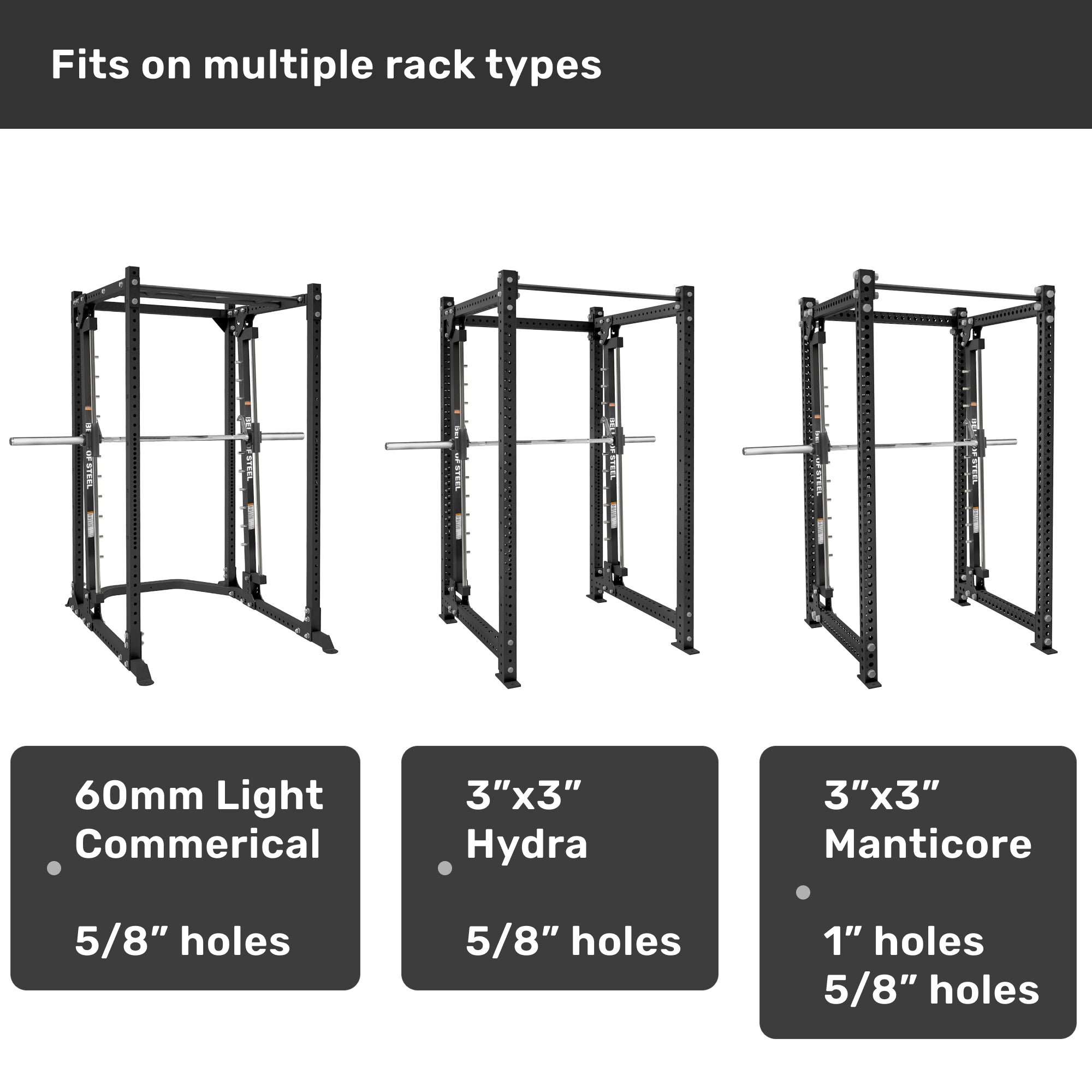 The Smith Machine Rack Attachment turns your existing rack — Hydra, Manticore, 84" Light Commercial, or most 2.3"–3" racks — into a smooth, guided Smith machine without stealing a single extra inch of floor space. Sneaky, right?