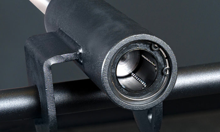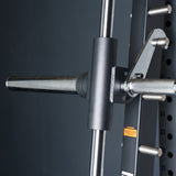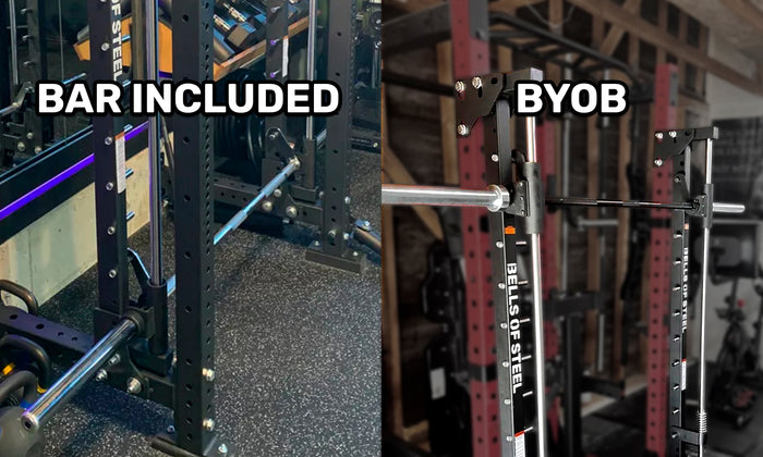 The BYOB version lets you use your own barbell instead of a fixed Smith bar. Your bar sits in clamshell-style trolleys that glide along the guide rails, giving you the same controlled Smith machine movement while using the bar you already own. This allows you to customize the feel, knurling, and starting weight of your setup.