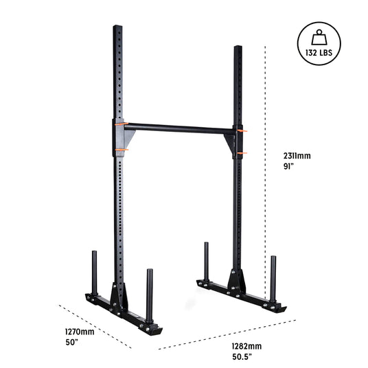 Add a pair of 60mm j-cups and spotter arms to create a squat stand. The superior 1" spacing through the bench and pull zone helps achieve the perfect height for you and/or your training partners.