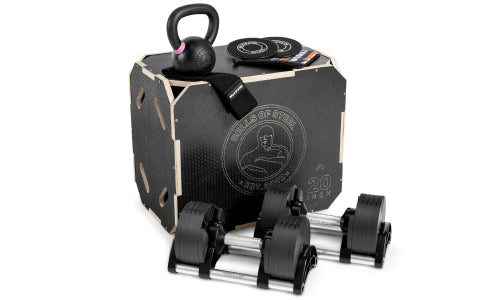Alright goal-getter, we get it: this ain't your first rodeo. In this kit, you get the 22lb kettlebell, the medium plyo-box, the 5-50lb set of NUOBELL adjustable dumbbells, a glute loop, and core soldiers. Ye-freaking-haw!